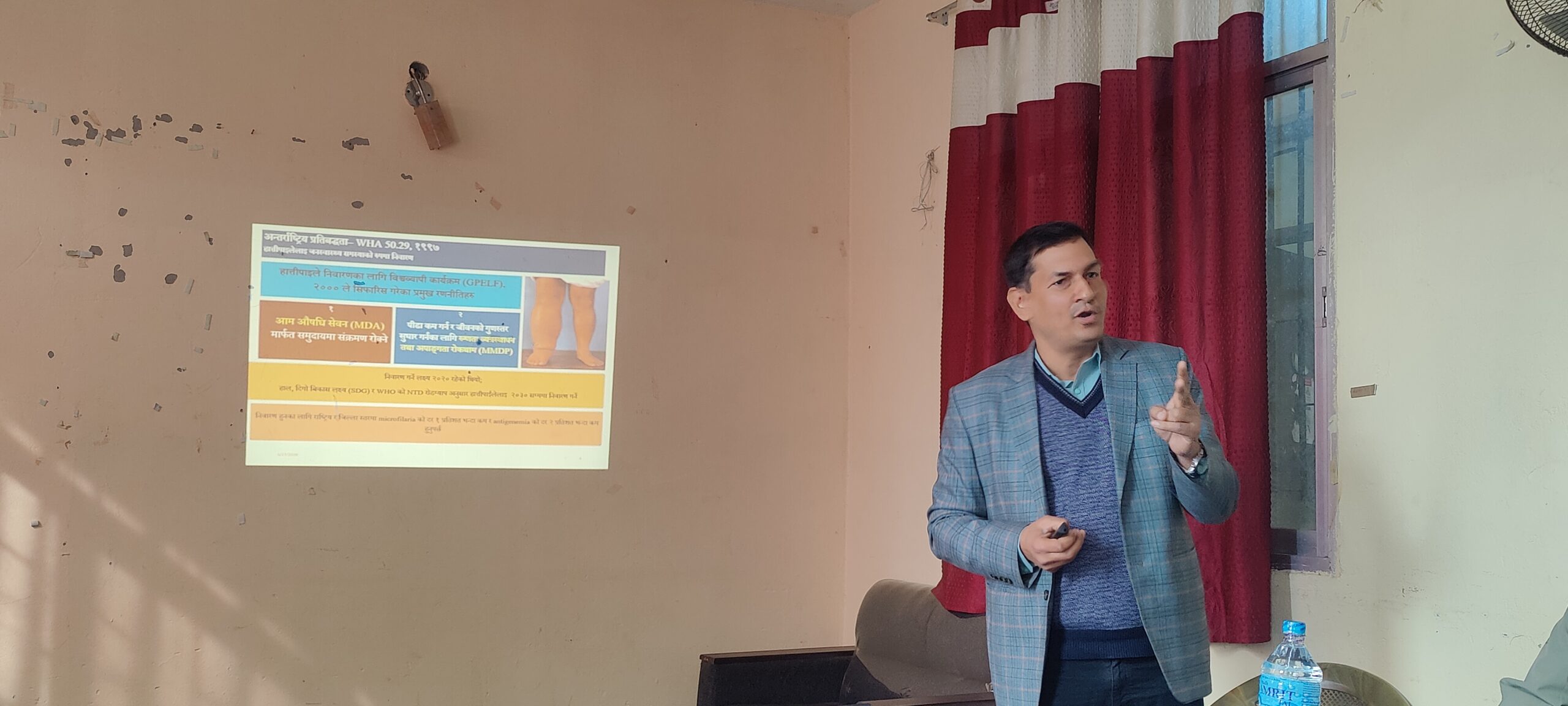 कार्यक्रममा हातीपाइले रोगको अवस्थावारे प्रष्ट पार्दै इपिडिमियोलोजी तथा रोग नियन्त्रण महाशाखा टेकु काठमाडौंकाबाट आउनु भएका डा. गोकर्ण दाहालले हात्तीपाइले रोग उन्मूलनका लागि आम औषधी सेवन अभियान अत्यन्तै प्रभावकारी र आवश्यक रणनीति रहेको बताउनु भएको छ ।